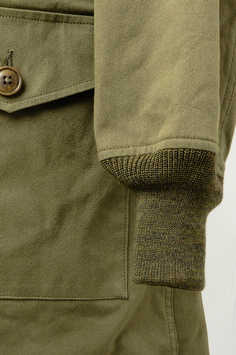 両胸のハンドウォーマーポケットやその下の大容量のフラップポケットも大きな特徴です。 ウール100%のリブや2重の前立てによって防風性も抜群。