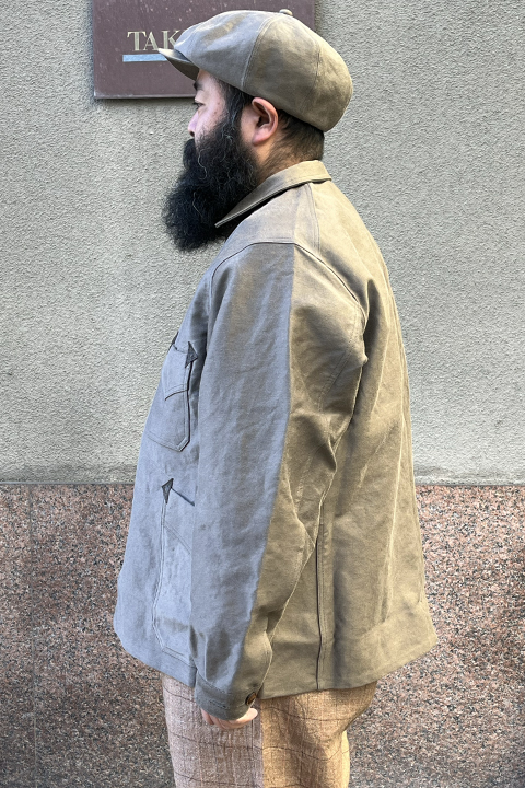オックスドシルバーライン1920年代の漁師がデザインのベース。生地は綾織りで、コットンモールスキンの生地感です。柿渋染めをクレに漬け込み反応させる古来からの手法を使っています。忍者の服もこの染め方が使われていたそうです。以前のモデルよりもアームホールがやや絞られているので一枚でもまとまりが非常に良いジャケットです。