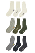 1色につき3種の製法と異なるデザインの3パックアーミーソックス。
