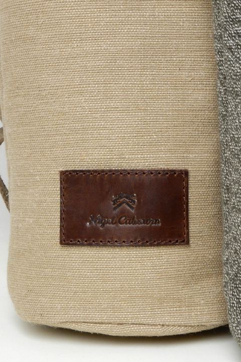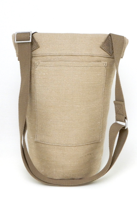 デザインのベースは1940年代の英国陸軍に運用された携行用弾丸ケース。ファブリックは、スイス軍山岳部隊のリュックサックにインスピレーションを得て作られたものと、ナチュラルな風合いのジュート素材の経年変化が期待できる2種類。高さ27cm、幅14cm、奥行11.5cmで、500mlペットボトルや10インチタブレットなども楽々収納できます。背面にスマートフォンなども簡単に出し入れできるポケットを搭載。ストラップは斜め掛けも可能。