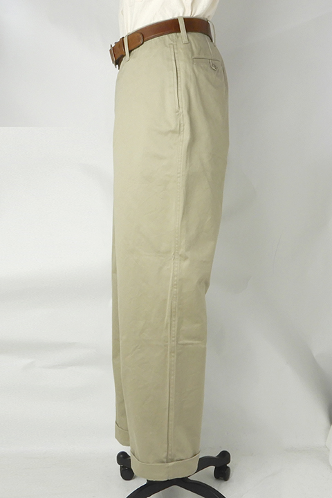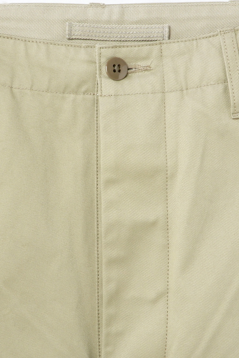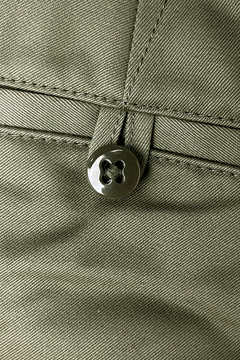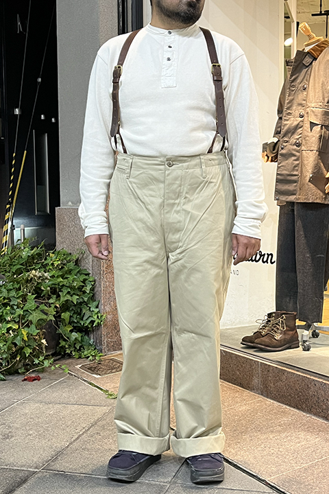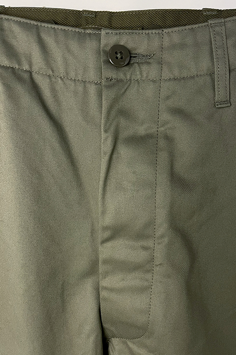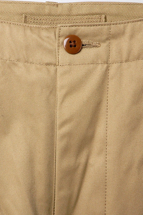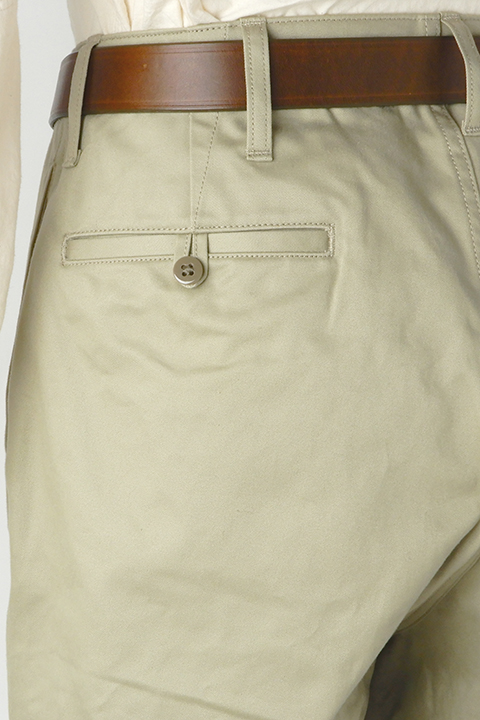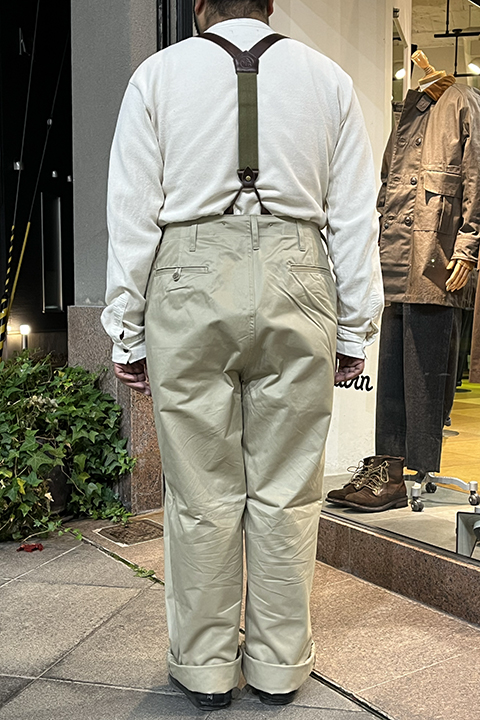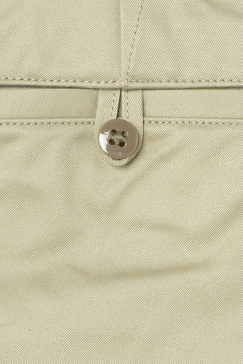 新しく起用されたライトベージュのカラーリングは40年代の海軍学校で主に運用されたやや緑みを帯びた特徴的な色合い。前作から引き継がれたベージュは温かく深みのある色味です。前作のコロゾボタンに変わって、当時のミリタリーパンツに多く見られる尿素ボタンを採用し、より時代性を味わえる一本に生まれ変わりました。