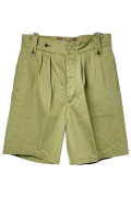 1940年代初頭から英国陸軍に運用されたバトルドレスパンツ。 中でも1949年から1950年代半ばごろのクラシカルなパターンをベースにデザインされたショーツです。 銃などの装備品を携えたタクティカルベルトの着脱を容易にするボタン式ベルトループ、腰周りにゆとりをもたらすイン(内向き)・プリーツなどの英国らしいディテールが特徴的。サスペンダ ーも装着可能(内側ボタン式)です。生地は糸の中心まで浸透しない糸を使った硫化染め仕様。ボタンはココナッツから削り出したものです。