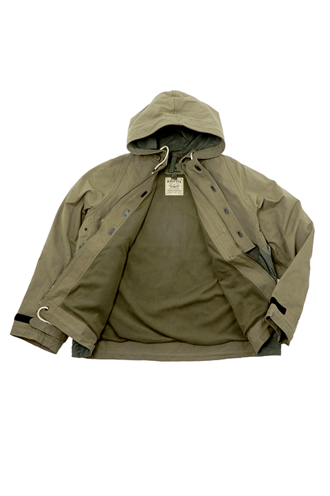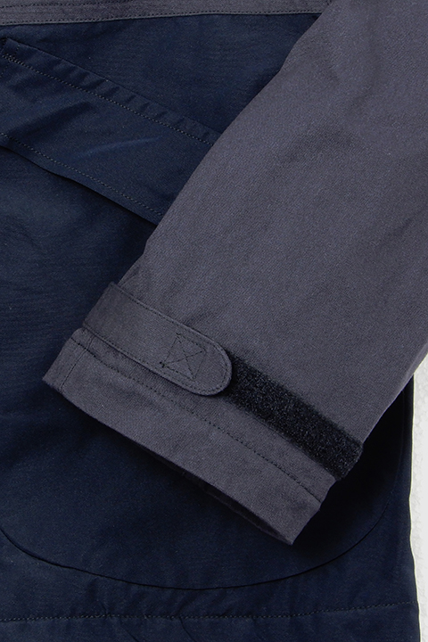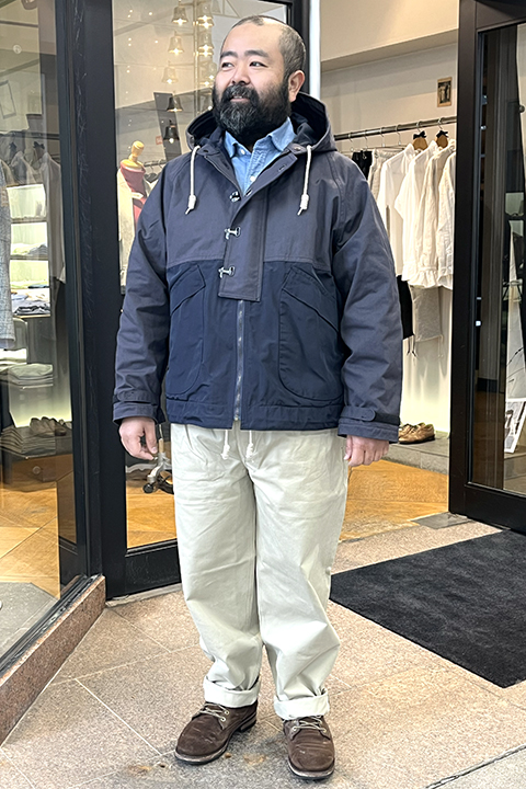 ビンテージデッキジャケットからインスピレーションされ作られました。生地は上部がハーフテックス(コットンの質感のナイロン)で下部が形状安定ポリエステル。ショート丈独特の着やすさとアームホール幅が広めにとっているので中に厚手のセーターなど着ることが可能です。重ね着が多様にできるカメラマンジャケットのショート丈版のような位置付けです。(店長ジャストサイズ50)