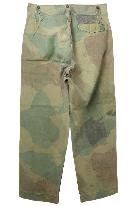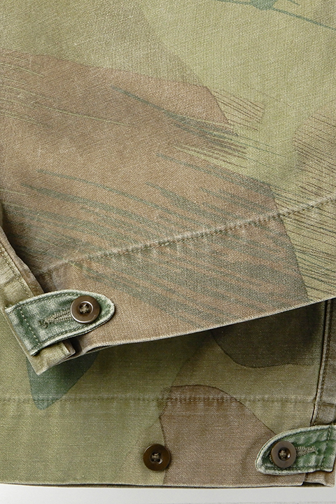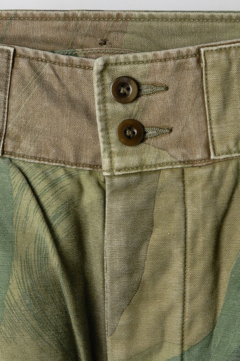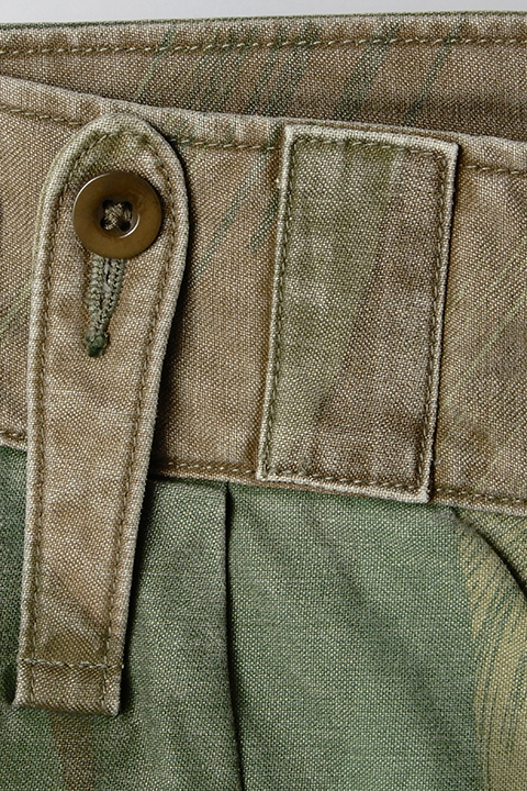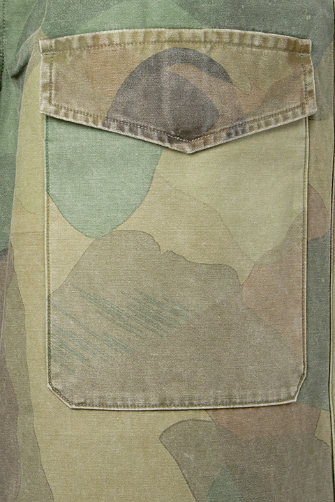 イギリス陸軍が運用していたパンツをベースにしています。右腰前面のマチ付きポケット、左腿のフラップ付きポケットは極めて象徴的で、一目でイギリス、あるいは大英帝国同盟軍のものと認識できます。カモフラージュプリントにバイオウォッシュをした仕様です。通常のブリティッシュアーミーパンツよりもタイト目なサイズになっています。