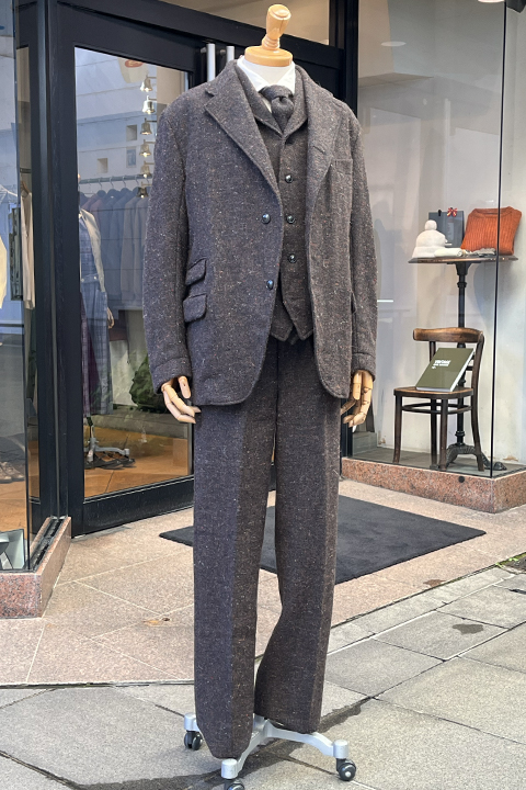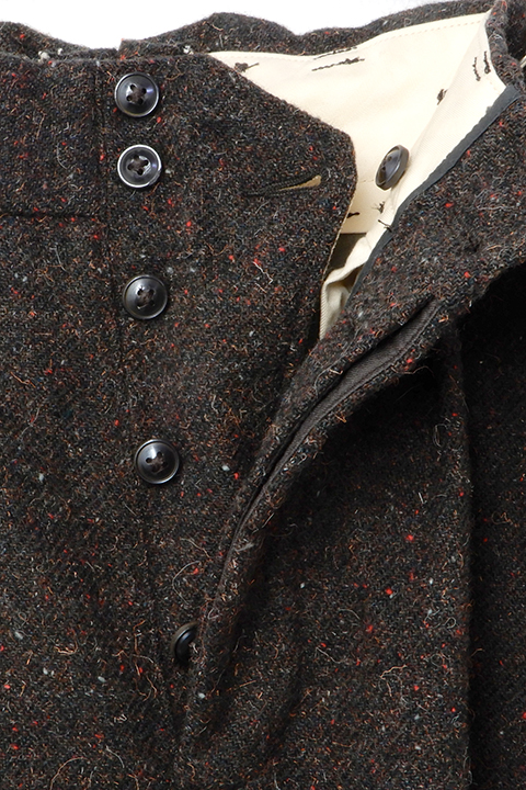 オックスドシルバーラインの中でもブラックスミス(鍛冶屋)が着ていたイメージを元に作られました。生地にはカラフルなネップ糸とハリスツイードより荒々しい表面が特徴的なドネガルツイードを採用。リーン、グレー、チャコールグレー、ワインレッドなど見る角度や光量で変わり不思議な発色をする生地感です。ツイードの楽しみを感じられる逸品です。バトルドレスパンツに近いシルエット。