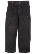 デザインのベースは1940年代の英国陸軍のバトルドレスパンツ。縦糸に黒の硫化染め、横糸にグレーの反応染めを用いることで、独特の深みのある表情が生まれます。右太腿上部のバンデージポケットやピストルベルト仕様の設計をを改造したベルトループなど、細部の特徴も存分に楽しめる一本。