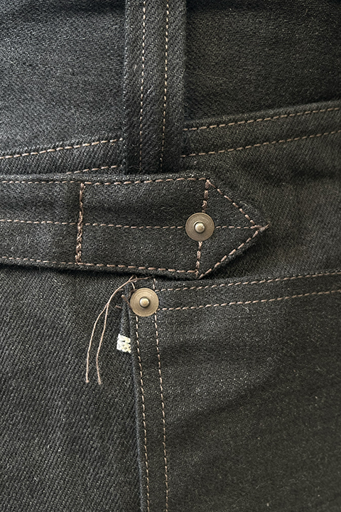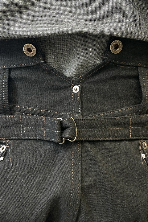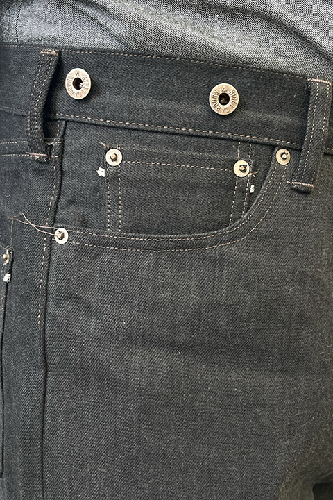 デニム生地と硫化染めの組み合わせによりインディゴ、グリーンよりも生地自体が硬くハリ感があります。通常サイズでもタイトに感じるかもしれませんがサイズを変えずにお選びくださいませ。