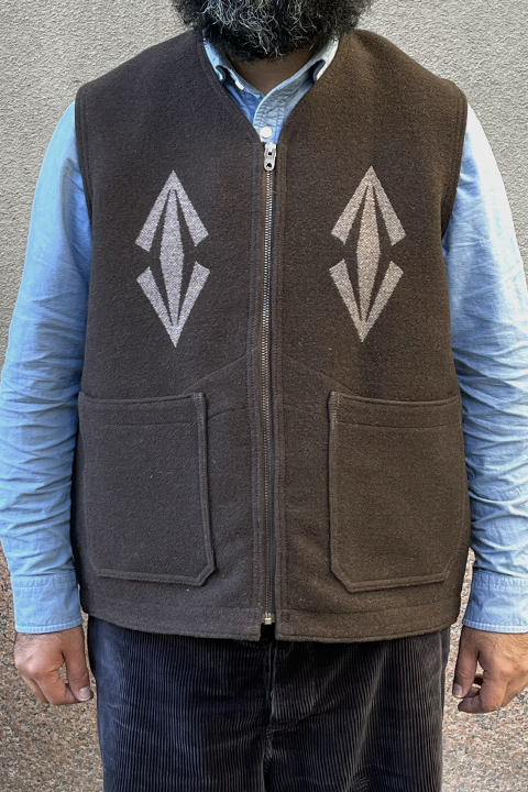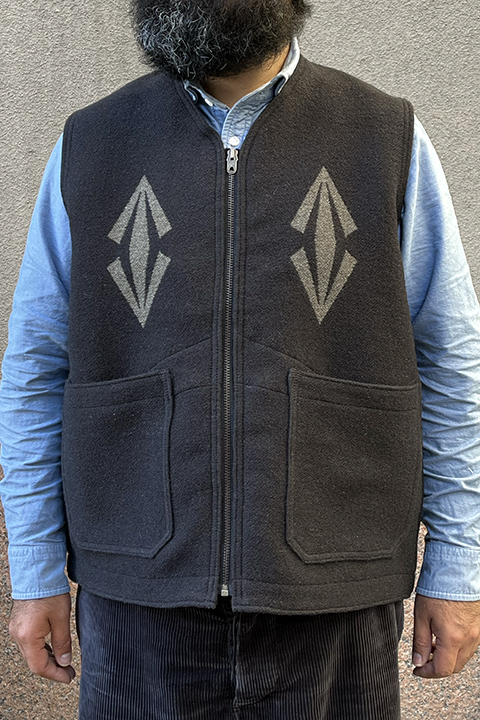 ジャカード生地のジップアップベスト。クラシックファスナーと落ち着いた色味で大人が着る民族柄と言う印象です。裏地はチャコールグレーがグリーン、ダークブラウンがグレーブラウン。※店長着用サイズ48、ゆったり目で50※B.C選んだ方におすすめです※ポイント二倍デー対象外
